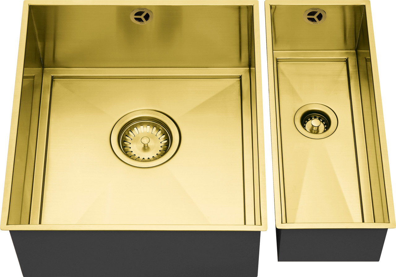 Upgrade your kitchen with this stunning 1810 AXIXUNO SET A – 355U & 150U Undermount 1.5 Bowl Sink in Gold Brass. Ergonomically crafted, this versatile large single bowl and small half bowl set combines premium handmade quality with a modern, luxurious aesthetic, perfect for busy kitchens. Constructed from durable 1.2mm stainless steel, it ensures long-lasting strength, while the radiant Gold Brass finish delivers a bold, high-end statement ideal for sophisticated and contemporary interiors.