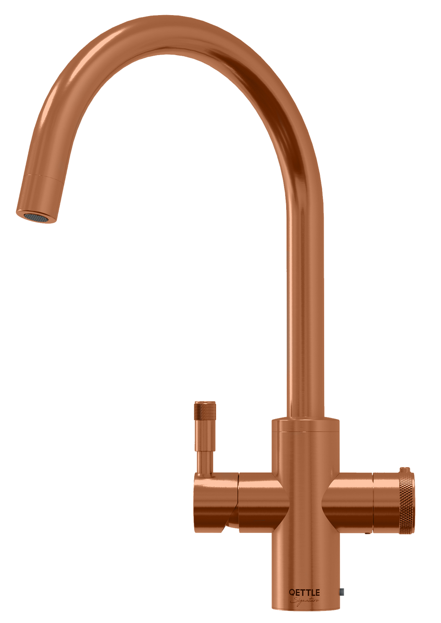 Add a warm and inviting touch to your kitchen with the QETTLE Signature 4 in 1 Round Copper Boiling Water Tap with 2L tank, expertly designed to deliver instant 100°C boiling water, filtered drinking water, and normal hot and cold flows. Skillfully crafted from high-quality materials and finished in stunning copper, this round spout British-designed marvel is perfect for small families. With its 2L tank, safety and ease of use are paramount, thanks to a two-stage safety system and a safety clip that ensure safe usage for everyone, including children.